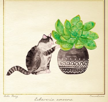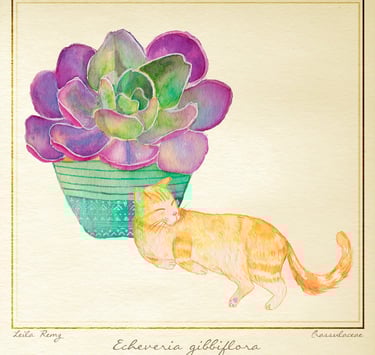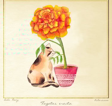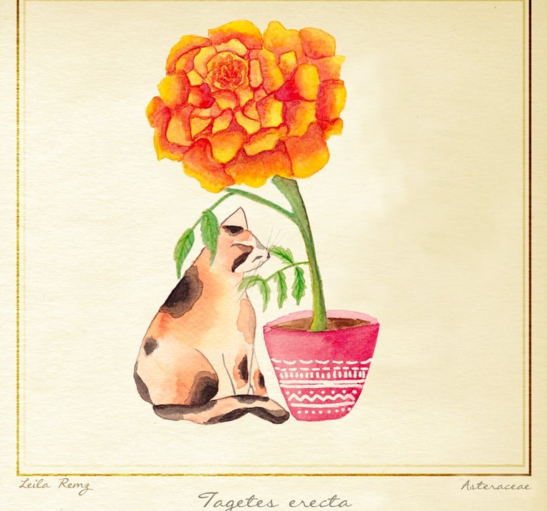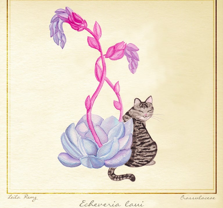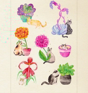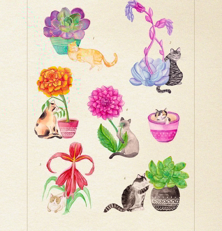 "Gatitos y flores" es una serie de especies de flores mexicanas acompañadas de gatitos, realizados con acuarela y lápices de color, en el que también se colocó su nombre científico.