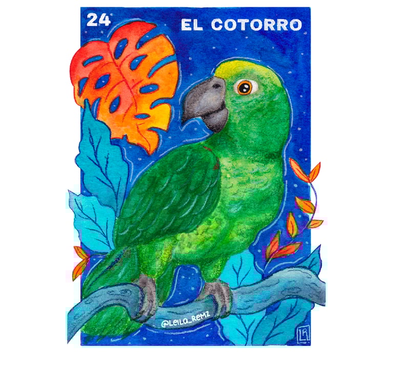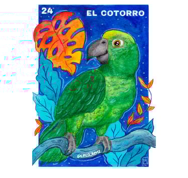 Ilustración para la carta "El cotorro" De La Lotería Mexicana junto con otros ilustradores xalapeños, colaboración dirigida por Sergio Elefante.