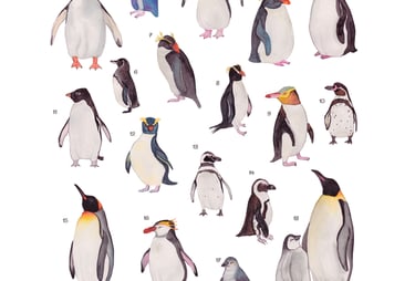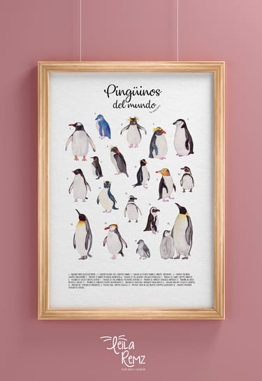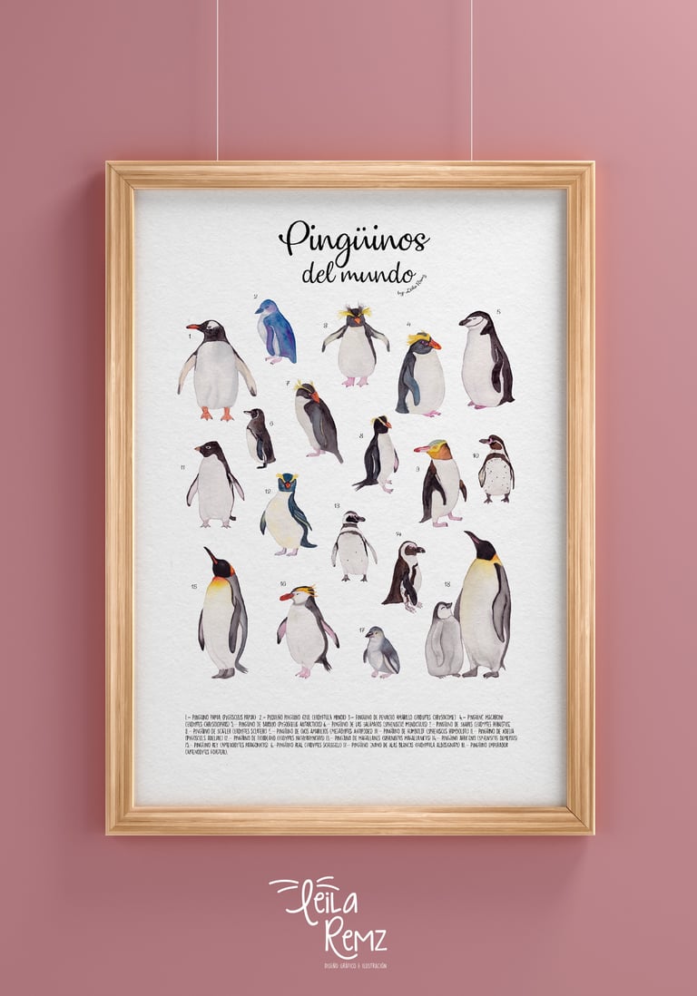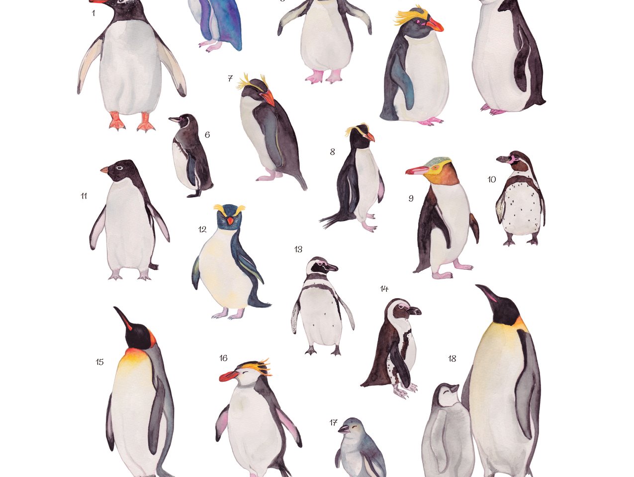 Proyecto personal en el que realicé las 18 especies de pingüinos del mundo, fueron realizados con acuarela y lápiz de color, se hicieron postales, prints, además jugué con las ilustraciones para poder realizar pequeñas infografías.